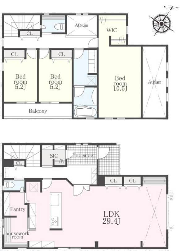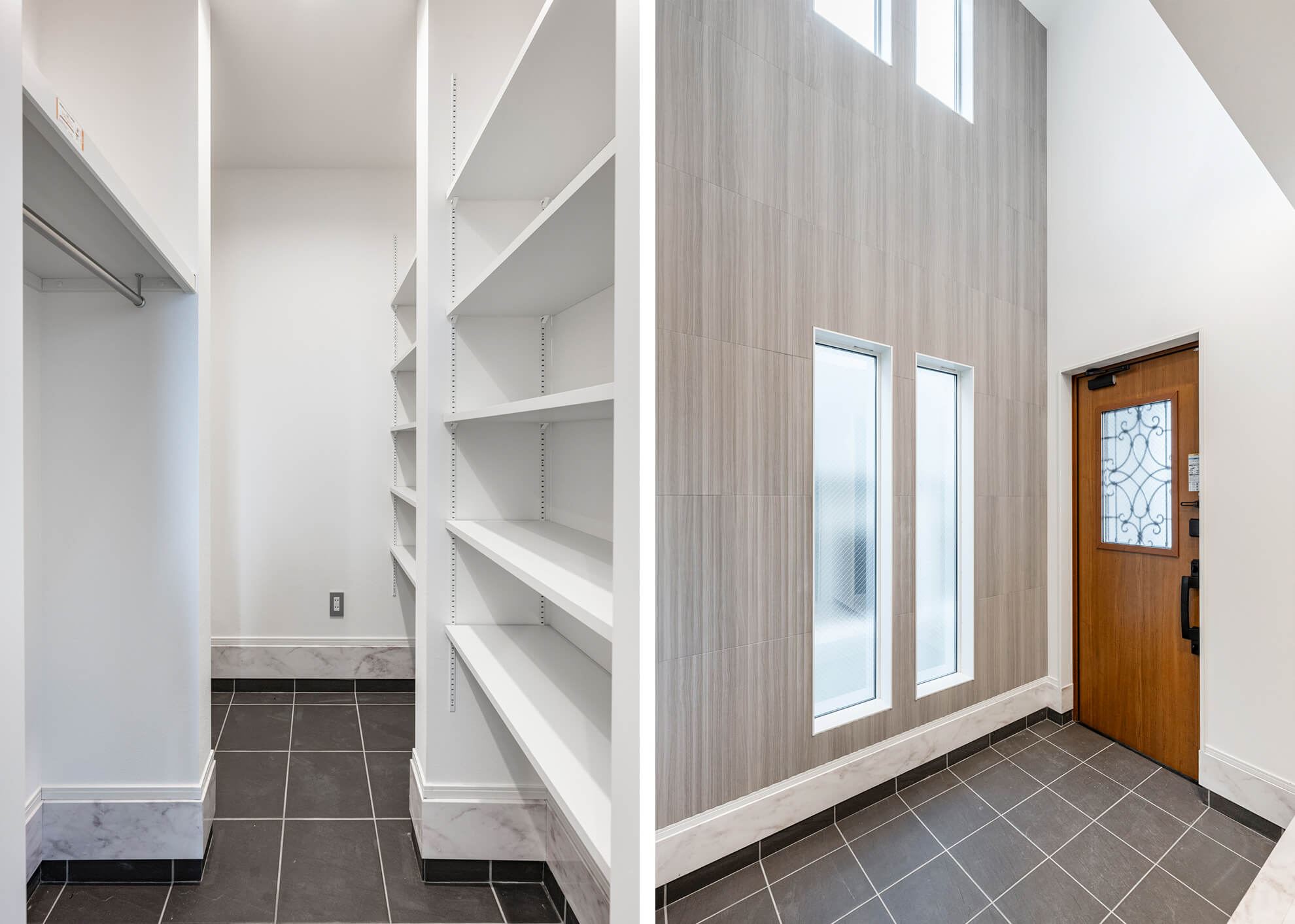 写真|左:SIC(シューズインクローゼット、コート掛け・たっぷり収納)、右:高さのある明るいエントランス