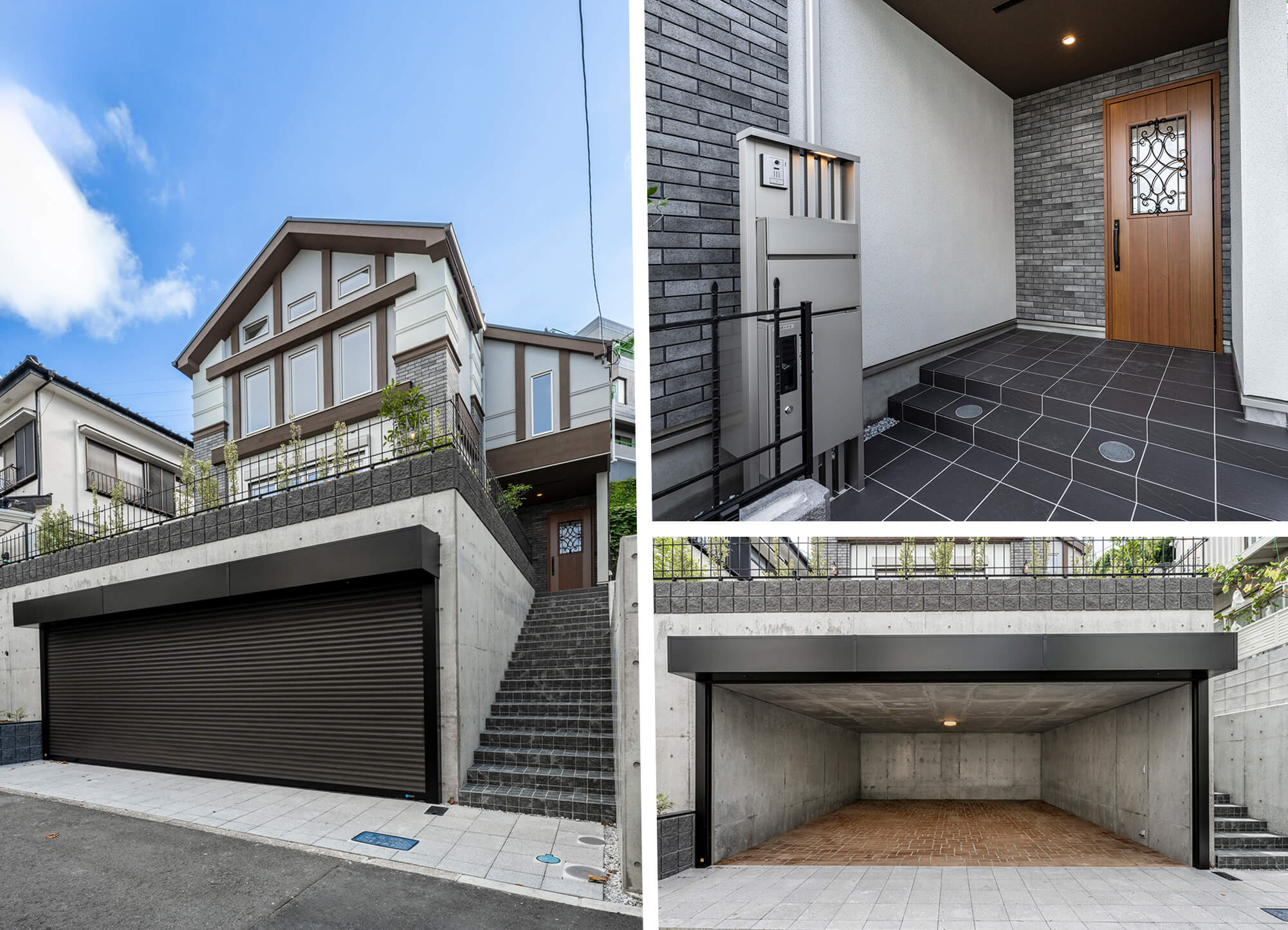 写真|左:シャッター付きビルトインガレージ、右:エントランス