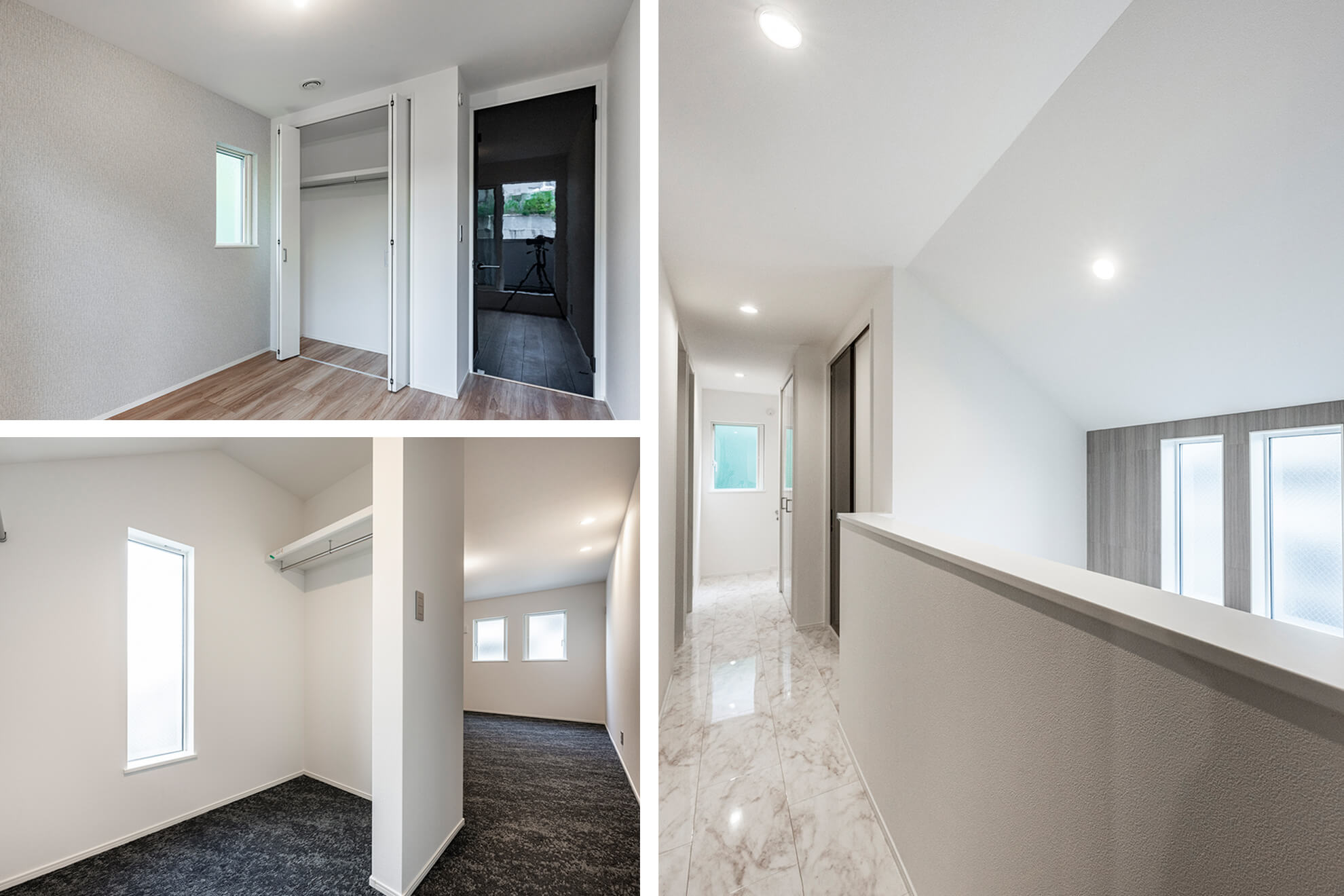 写真|左上:寝室、左下:主寝室のウォークインクローゼット、右:階段、廊下