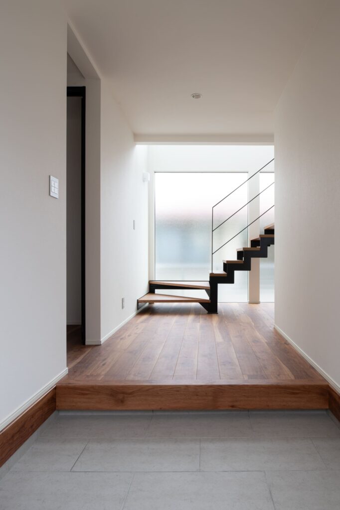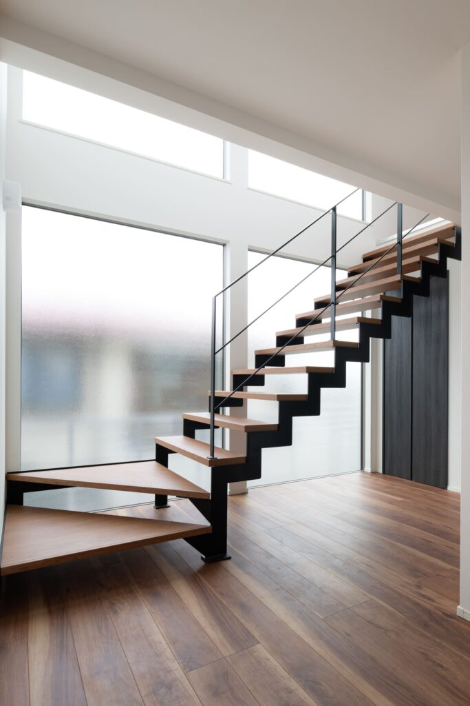 階段には、鉄骨と木材を組み合わせたスケルトン階段を採用しました。光を遮ることなく、階段自体がインテリアの一部として機能し、空間に軽快なリズムと広がりを与えています。足元のすりガラス調の窓も、採光とプライバシー保護を両立しています。
