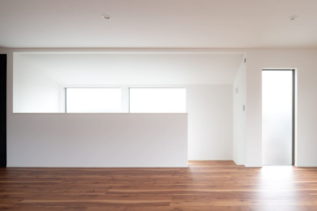 LDKは、明るいオーク柄のフローリングと白壁を基調とし、大きな開口部を設けることで、昼間は照明いらずの明るさを確保しました。窓の向こうには抜けが広がり、リビングにさらなる開放感をもたらしています。