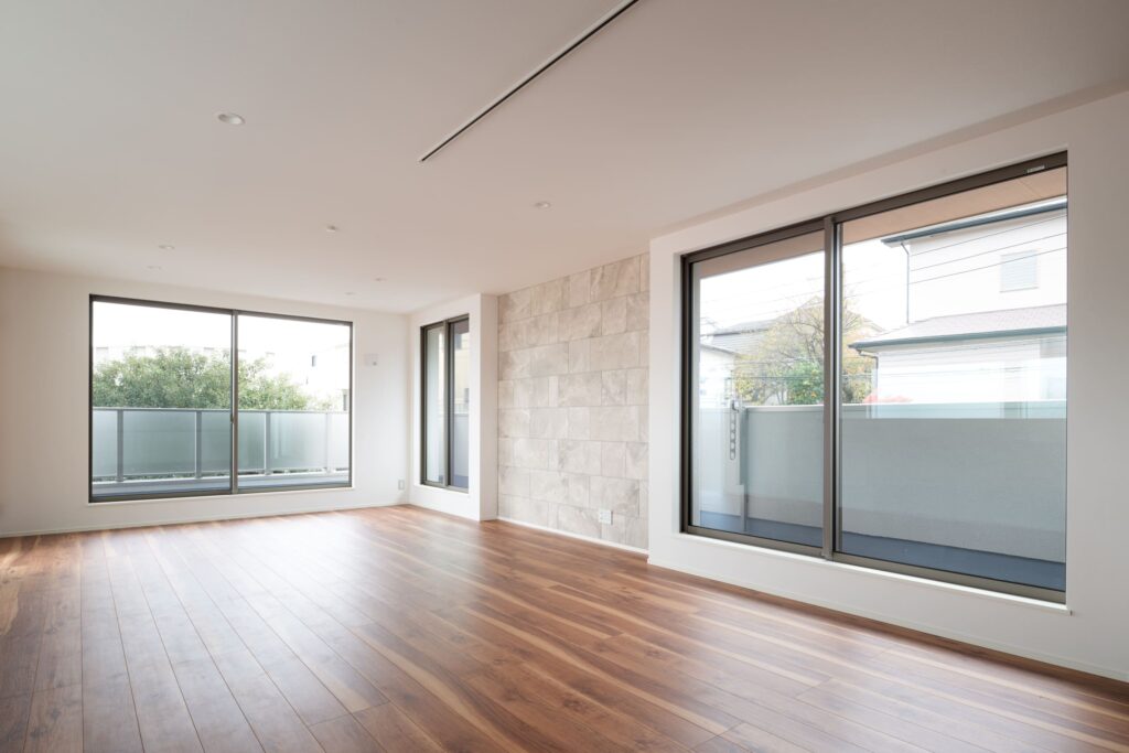 大きな窓から光が差し込む広々としたLDK