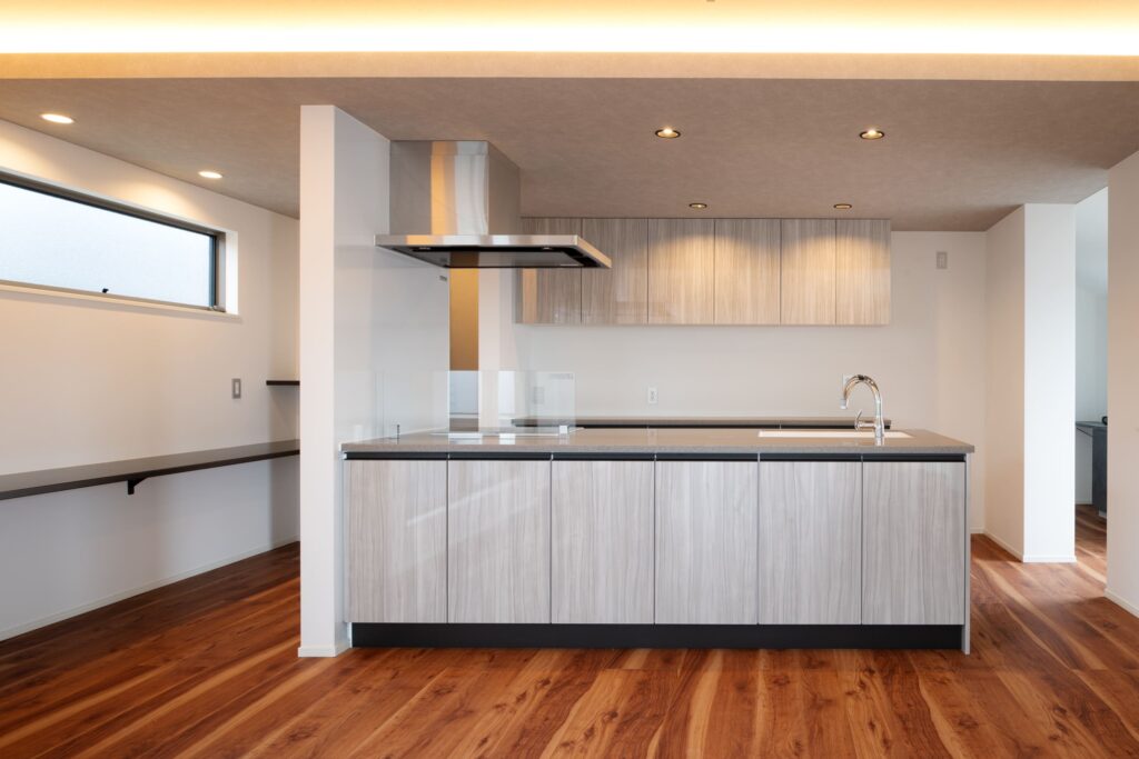 キッチンは、家族やゲストとの会話が楽しめるアイランド型を採用。グレー系の天板と木目調のキャビネットが、LDKのモダンな雰囲気に調和しています。天井の一部をダークトーンの素材で仕上げることで、空間にメリハリをつけ、キッチンエリアを独立した上質な空間として際立たせています。