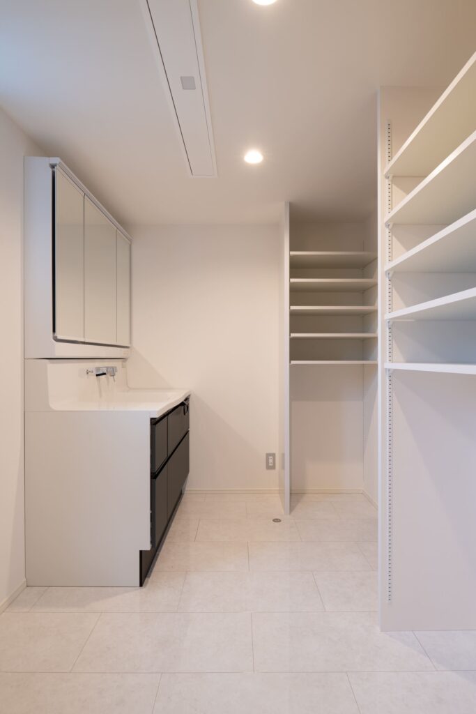 清潔感のある洗面脱衣室とリネン庫