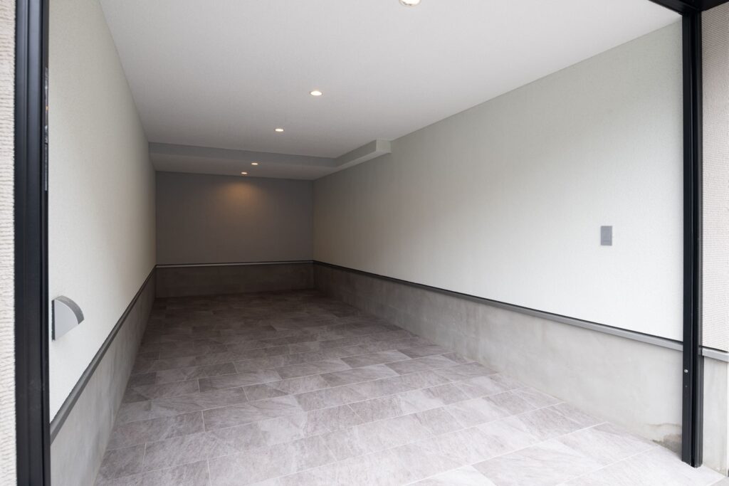都市の限られた敷地の中で、施主様の必須条件であったビルトインガレージを採用しました。雨の日でも濡れずに乗り降りできる利便性の高さはもちろん、建物のデザインの一部としてシャープな印象を与えます。
