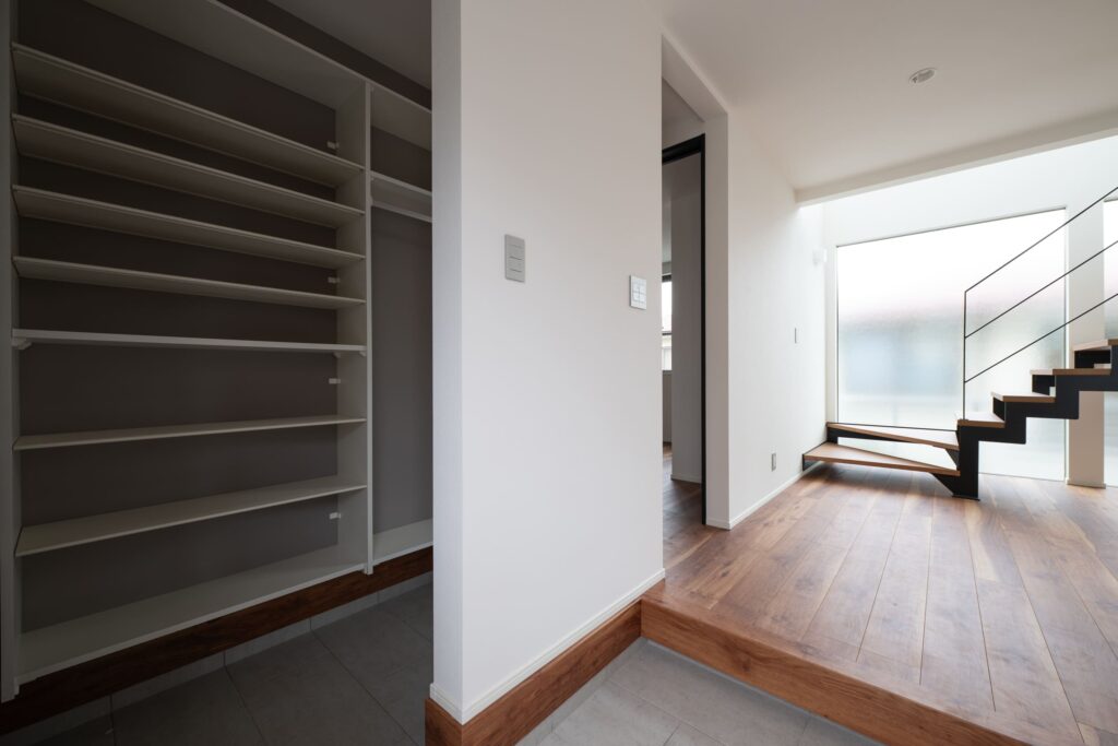 玄関からLDKへ続くアプローチには、大容量のシューズクロークを完備。可動棚で使い勝手も良く、靴だけでなく、外で使うアイテムなどもすっきりと収納できます。玄関ホールから見えるスケルトン階段は、訪れる人を印象づけます。