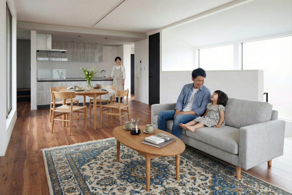 屋内では、開放的なLDKとスケルトン階段を採用し、光と風が巡るモダン・ラグジュアリーな空間を実現しました。オーク柄のフローリングと天然石調のアクセントウォールが、洗練された上質感を演出します。機能性とデザイン性を両立させた、都市生活を満喫するための住まいをご覧ください。