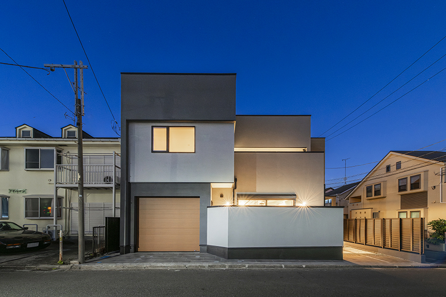 外観はフラット屋根に片流れ屋根がアクセントになる立体的なフォルム。