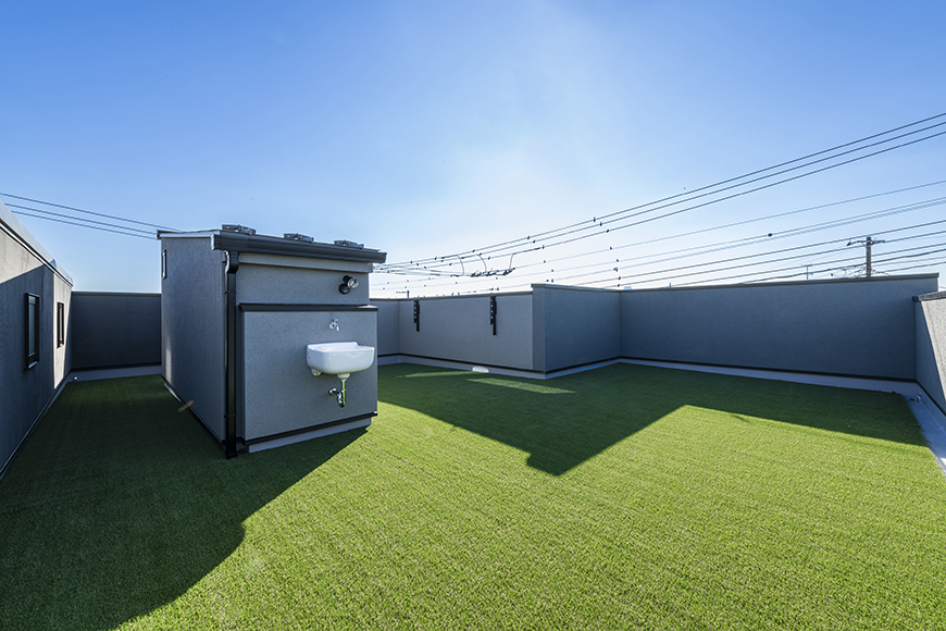 階段を上がると屋上テラスがある構造です。壁の高さは1.2~1.4メートルありますのでプライバシーを確保した屋上アウトリビングです。多目的シンクもありますので、ペットと遊んだり、バーベキューの準備や後片付けもしやすいですね。
