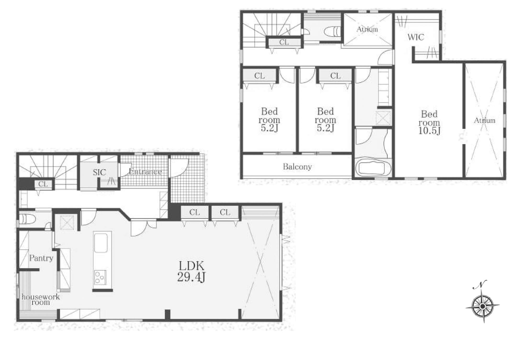延べ床面積146.5㎡(地下車庫除く)、広いリビングと吹き抜け、解放感あるオープンテラス、インナーガレージ付き。
