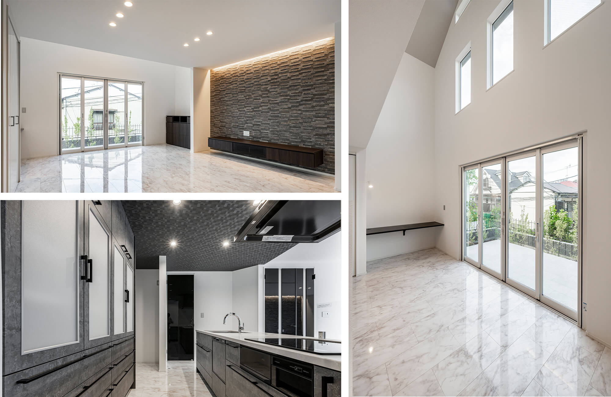 北欧テイストの外観、広々としたインナーガレージ、明るく開放的な吹き抜けの玄関とリビング、キッチンはチャコールグレーのアクセントカラーでシックな印象