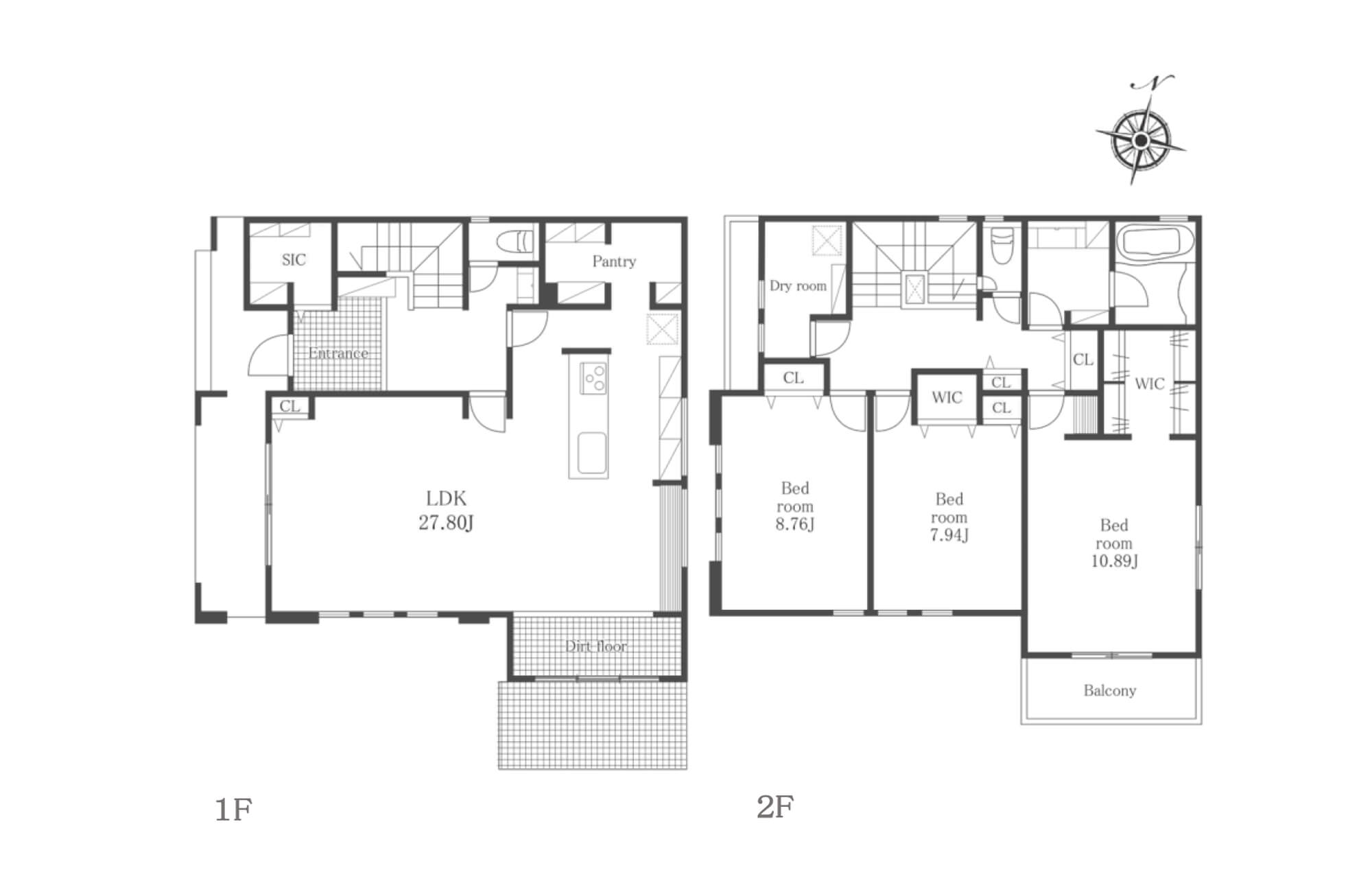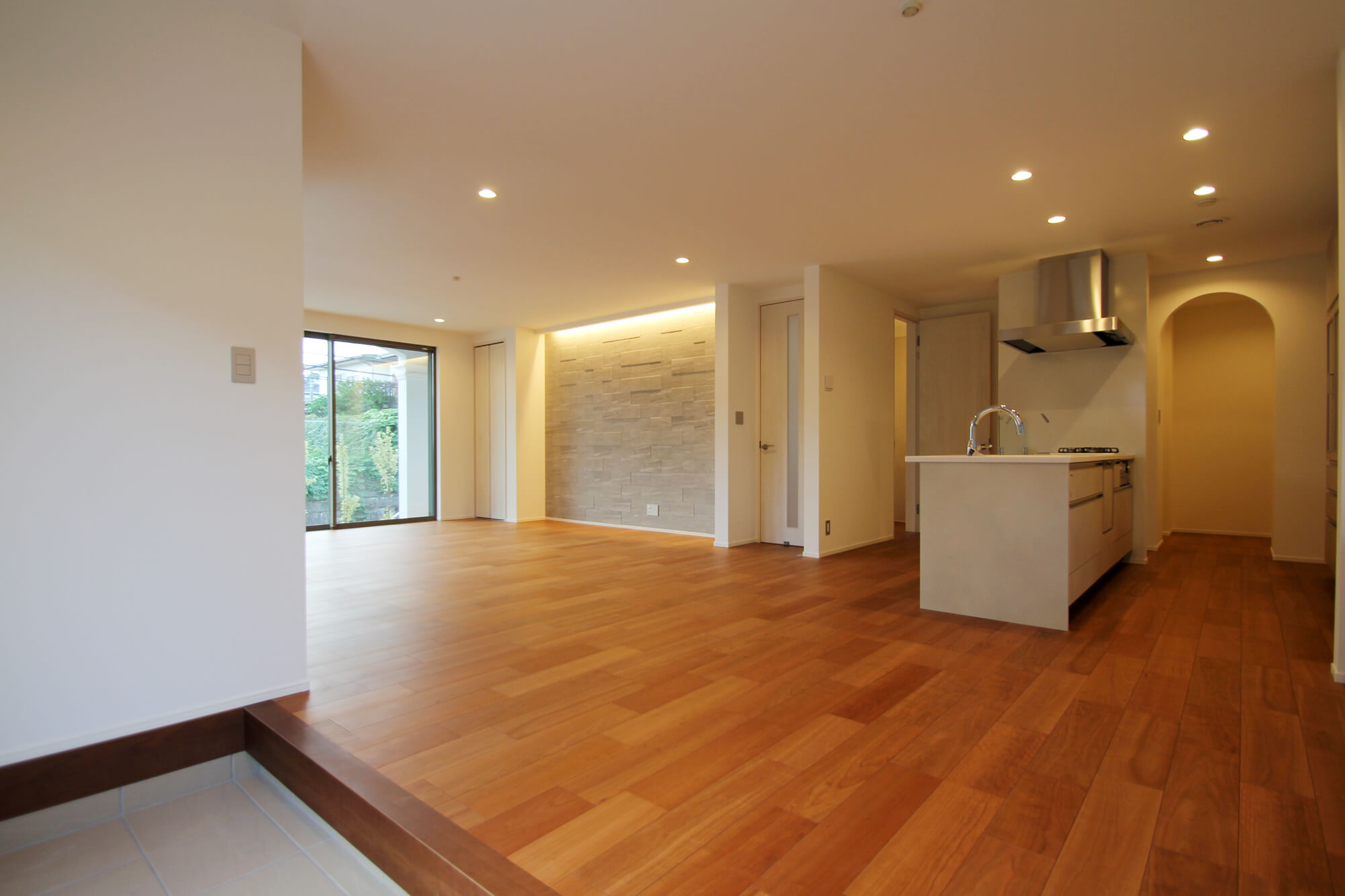 玄関にはシューズインクローゼット、27.8㎡の広々リビング、アイランドキッチンの奥にはパントリールーム、テラスへ続く土間のある家