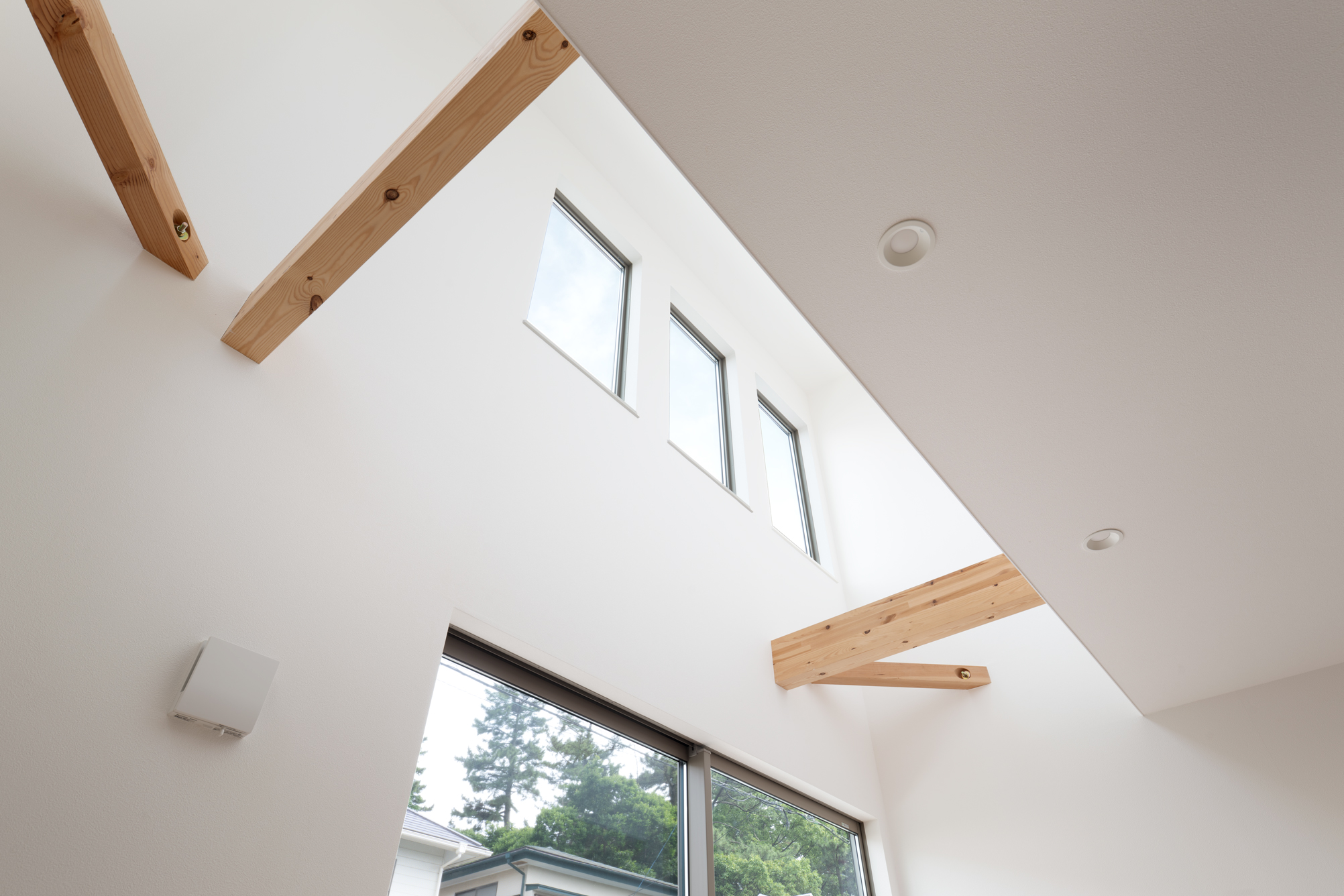 家族が集まるリビングダイニングの快適性はもちろん、奥様目線の家事が楽な動線設計。リビング上部には高窓と解放感ある吹き抜けにし、「光と風を感じることができる家」を設計しました。