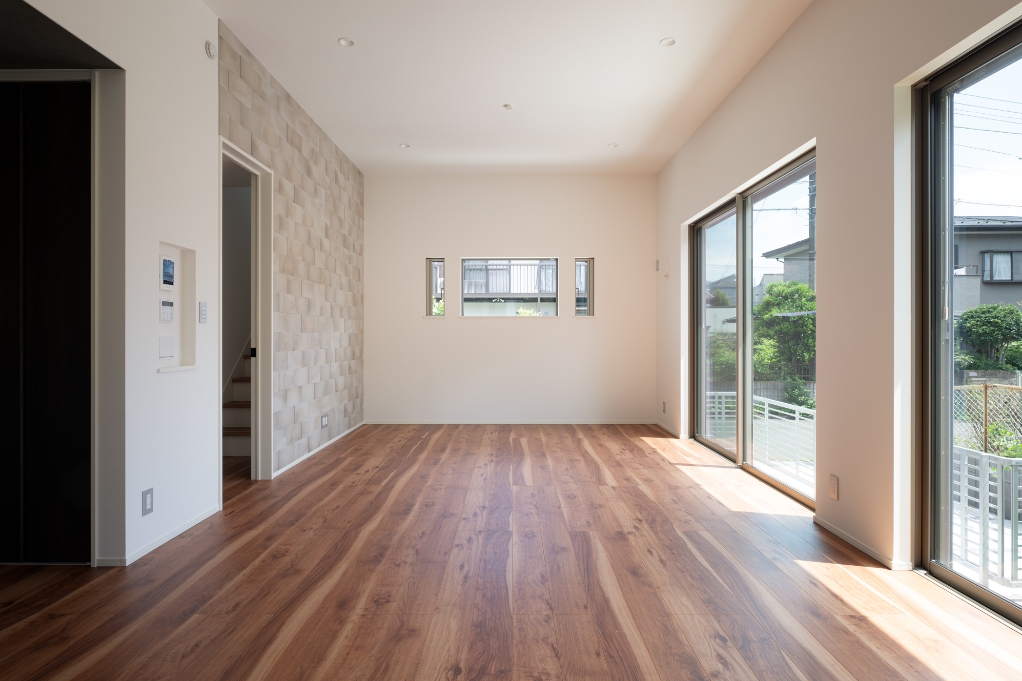 LDK全体が明るい陽光に包まれる邸宅。自然光だけで心地よく過ごせるリビングは、家族みんなの特等席です。