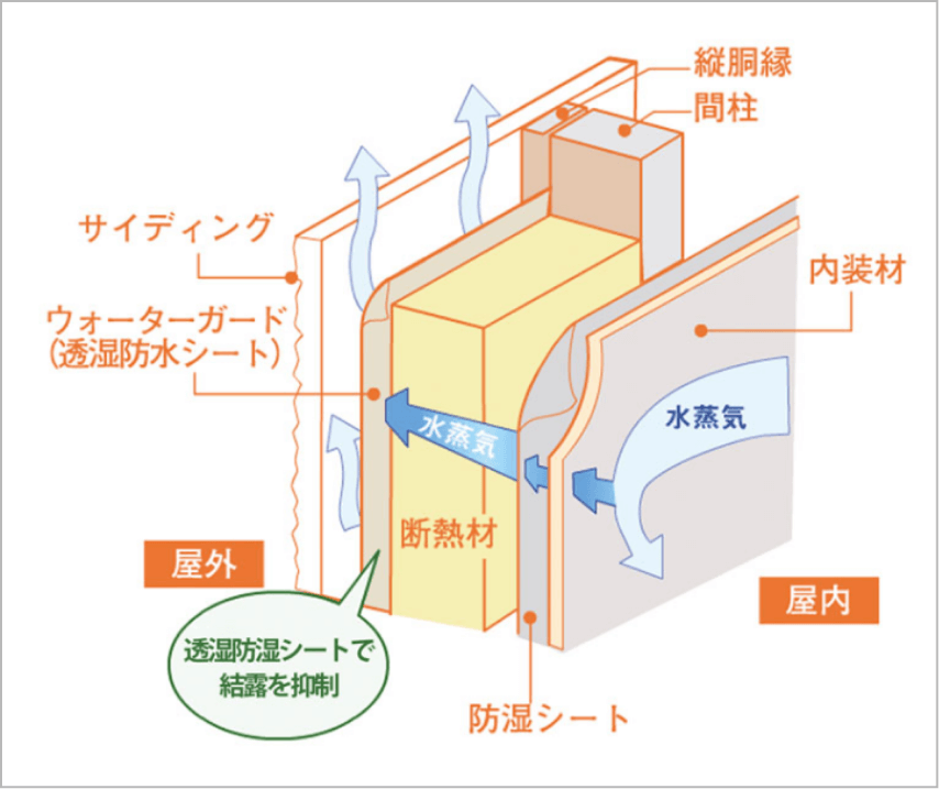ウォーターガードを使用し、標準施工に準じた「通気構造」とすることにより、すみやかに湿気を外部に放出させ、内部結露を抑制することができます。