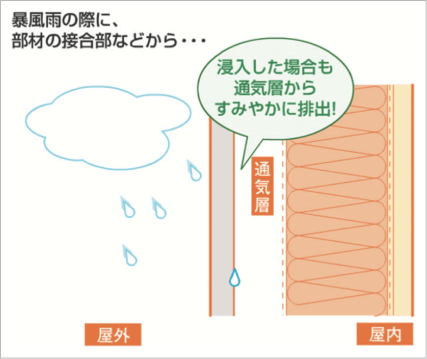 「通気構造」では暴風雨時には部材の接合部などから浸入した雨水をすみやかに排出することができます。また、ウォーターガードにより屋内への雨水の浸入を防ぐことができます。