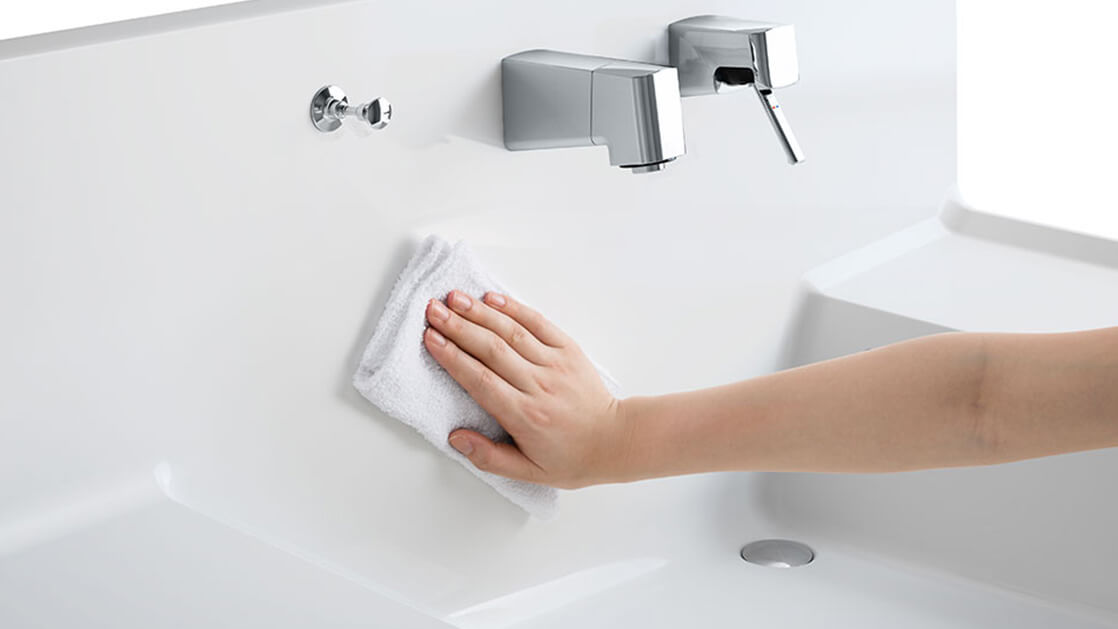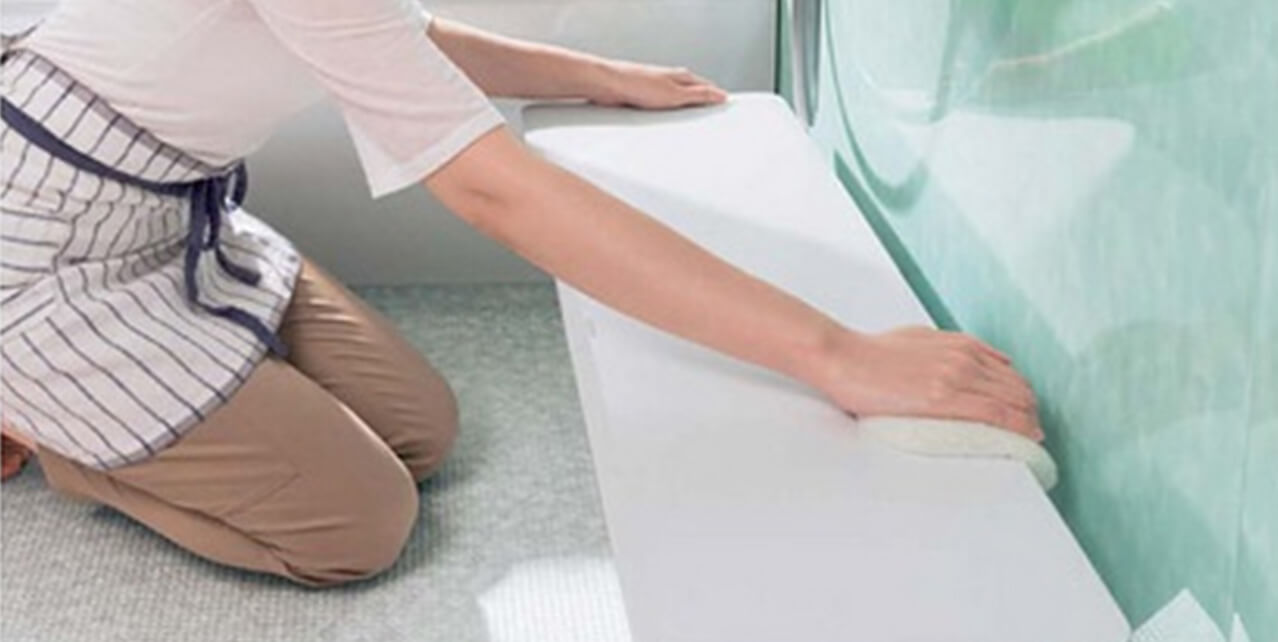 壁や浴槽と離すことで、汚れがたまりにくいデザインに。掃除のしにくかったカウンターの奥や側面、カウンターの下の壁際まで手が届き、お掃除が簡単です。 -