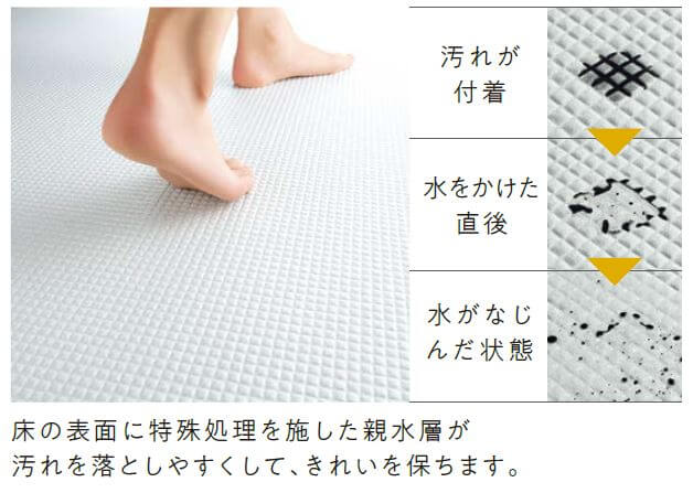 翌朝にはカラッとさわやか。靴下のまま入っても大丈夫。タテヨコ規則正しい床パターンでお手入れカンタン、お掃除ラクラクです。