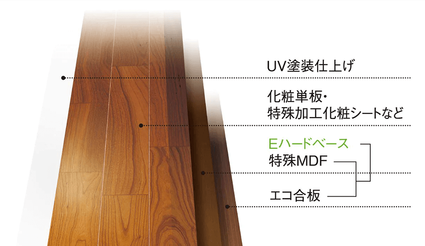 高圧プレス製法から生まれるメラミン化粧板は抜群の耐久性を持ち、いつまでも美しい外観を保ちます。