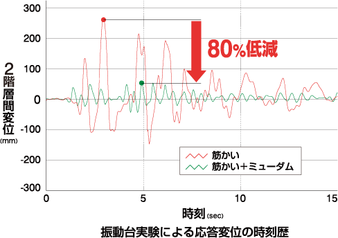 従来の木製筋かいにミューダム®を追加した実大2階建住宅に、兵庫県南部地震(1995年)を再現した振動台実験では、最大の揺れが80%も低減されました。