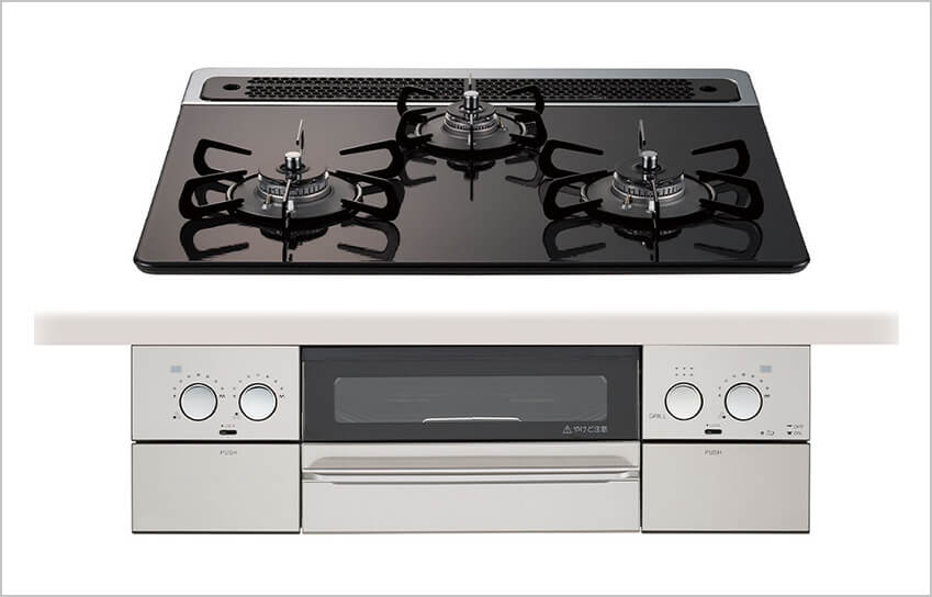両面焼きグリル、揚げ物温度調節、適温調理など10機能を搭載。ハイパーガラスコートトップ3口ガスコンロ全5色よりお選びいただけます。 -