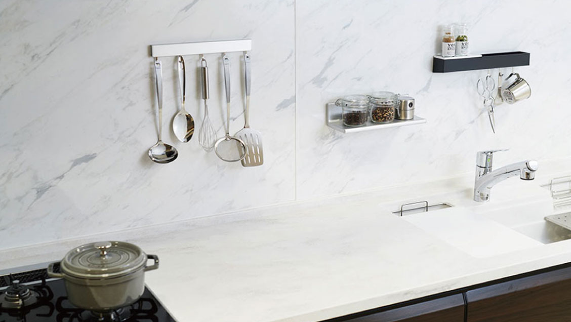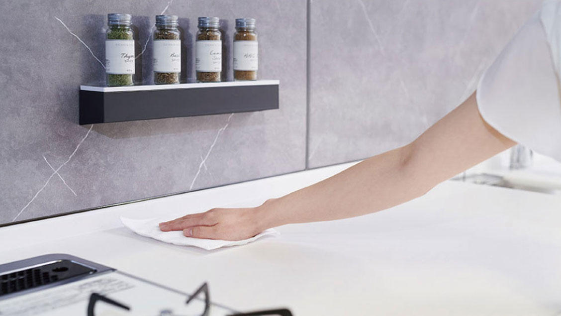 浮かす収納なら、物を動かさなくていいので、ワークトップの掃除もスムーズです。表面がガラス質なので、汚れや湿気・ニオイをガード。付着した油汚れも水拭きでサッと落とせます。頑固な汚れは、たわしでゴシゴシしても傷つきません。