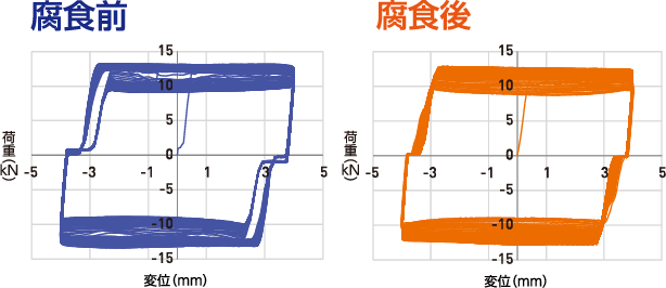 グラフの形状は、腐食後であっても、ミューダム®の耐力が低下することなく「安定した性能」であることを示しています。