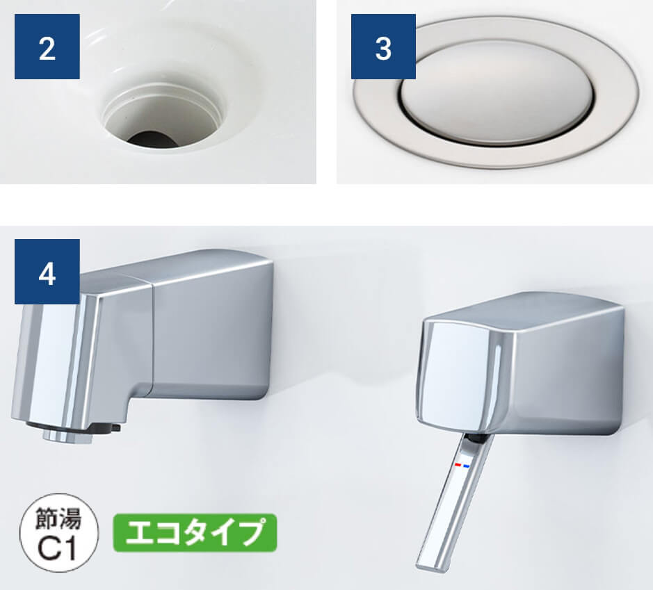 1:カウンター / 2:排水口 / 3:排水栓 / 4:クロムメッキ
