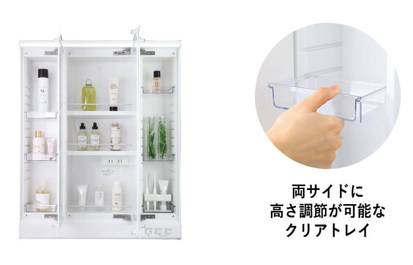 薄型ですっきりシンプルデザイン、ワイドな照明が快適な3面鏡。くもり止めコーティング:あり。コンセント:内部2口・外部2口