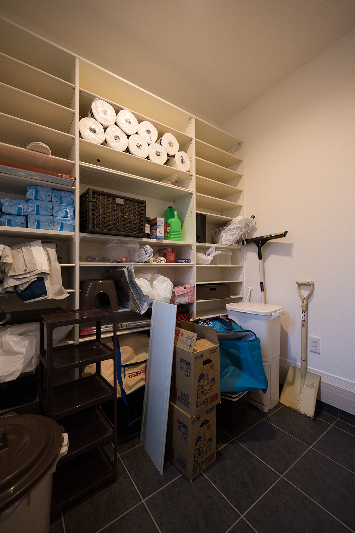 玄関横に土間スペースを作り、仕事の荷物が出し入れしやすくしています。大きな荷物が多いのでとても便利に使えています。