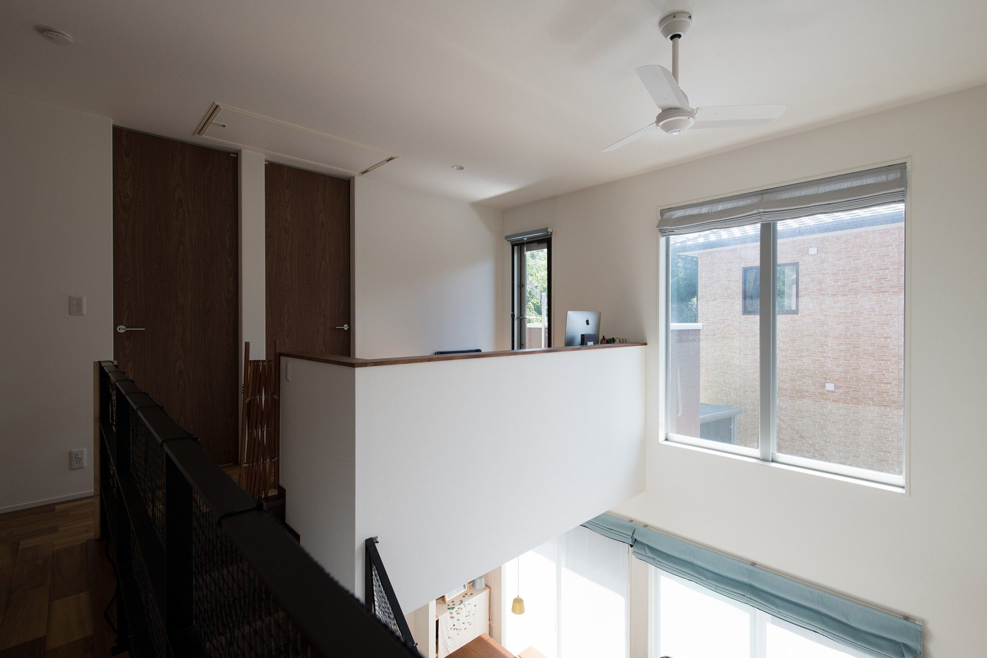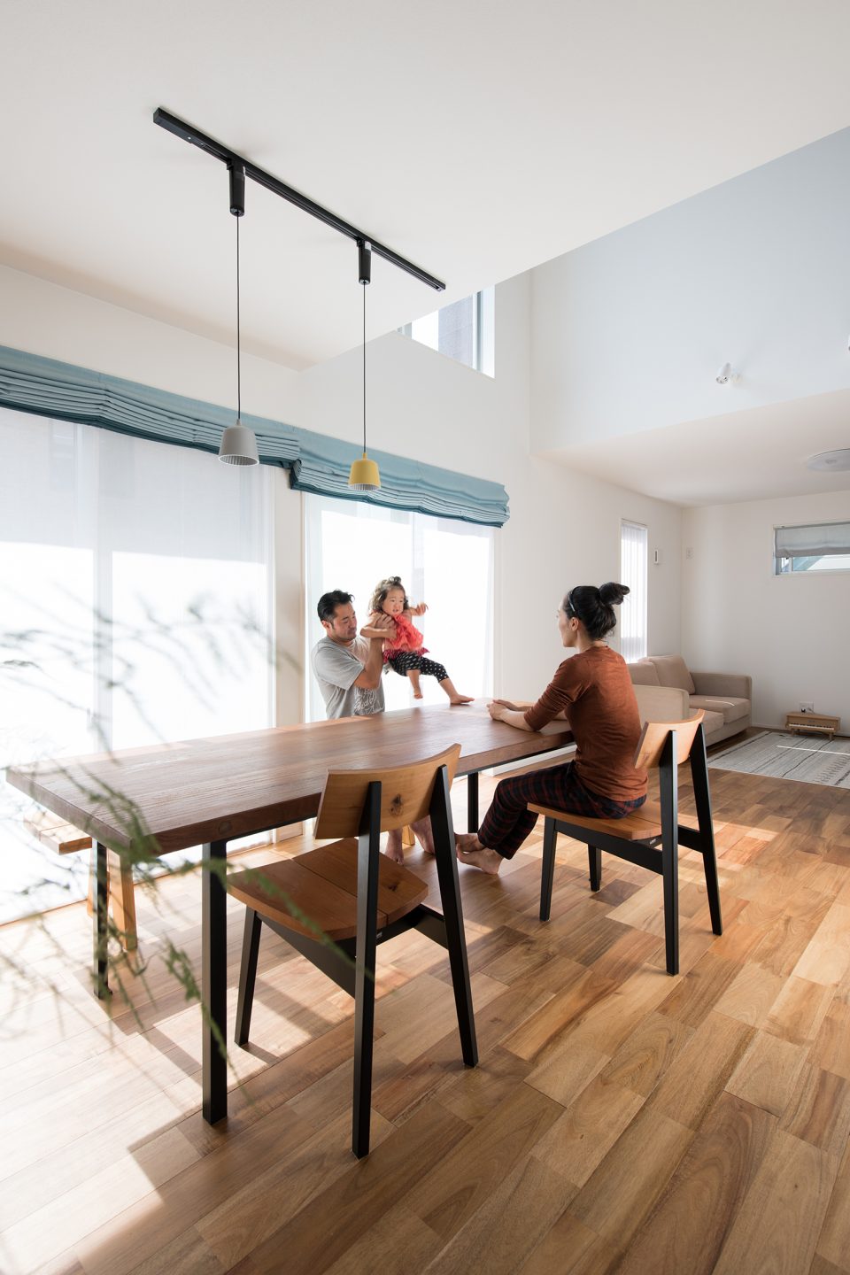 狭くても広く感じられる家が建てたかったので、廊下は作らずリビングに吹き抜けを作り、開放感が感じられるようにしました。