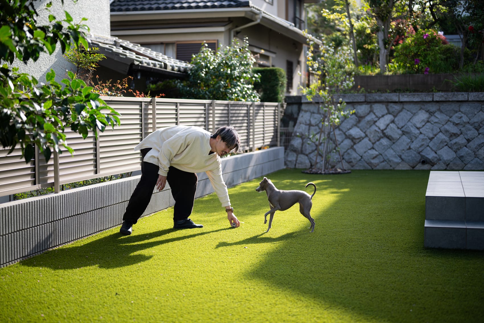 夫の一番のお気に入りは、外のお庭です。 朝起きて階段を降りてくるときに、ちょうど東側からの眩しい朝日を感じられるのがたまらないそうです。そのまま愛犬と一緒に庭に出て座り、ワンちゃんが庭をクンクンと嗅ぎ回っているのを眺める朝の時間が一番好きだと言っています。以前は夜型だったのですが、お庭で太陽を感じるこの時間が好きすぎて、今ではすっかり朝型生活に変わりました。