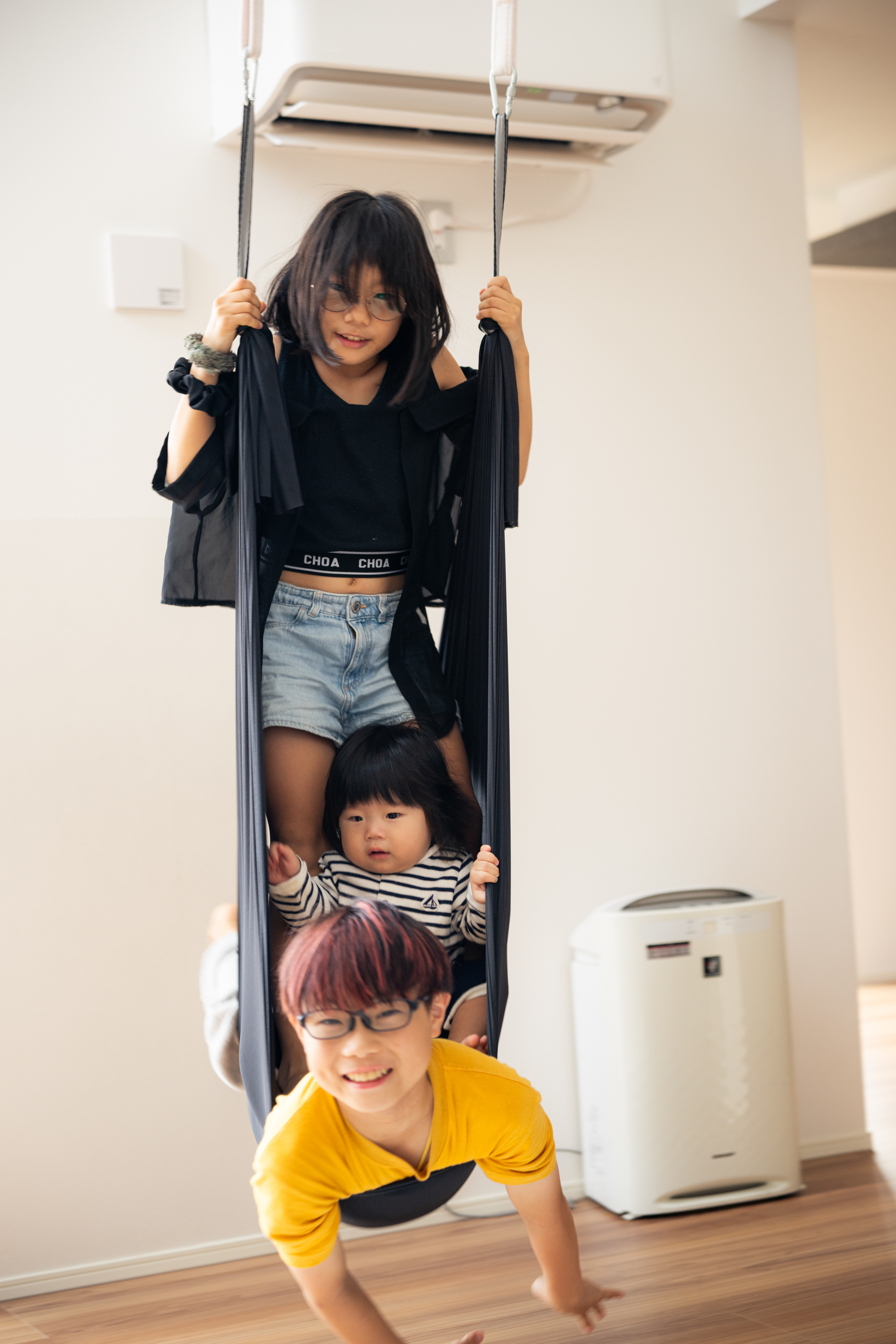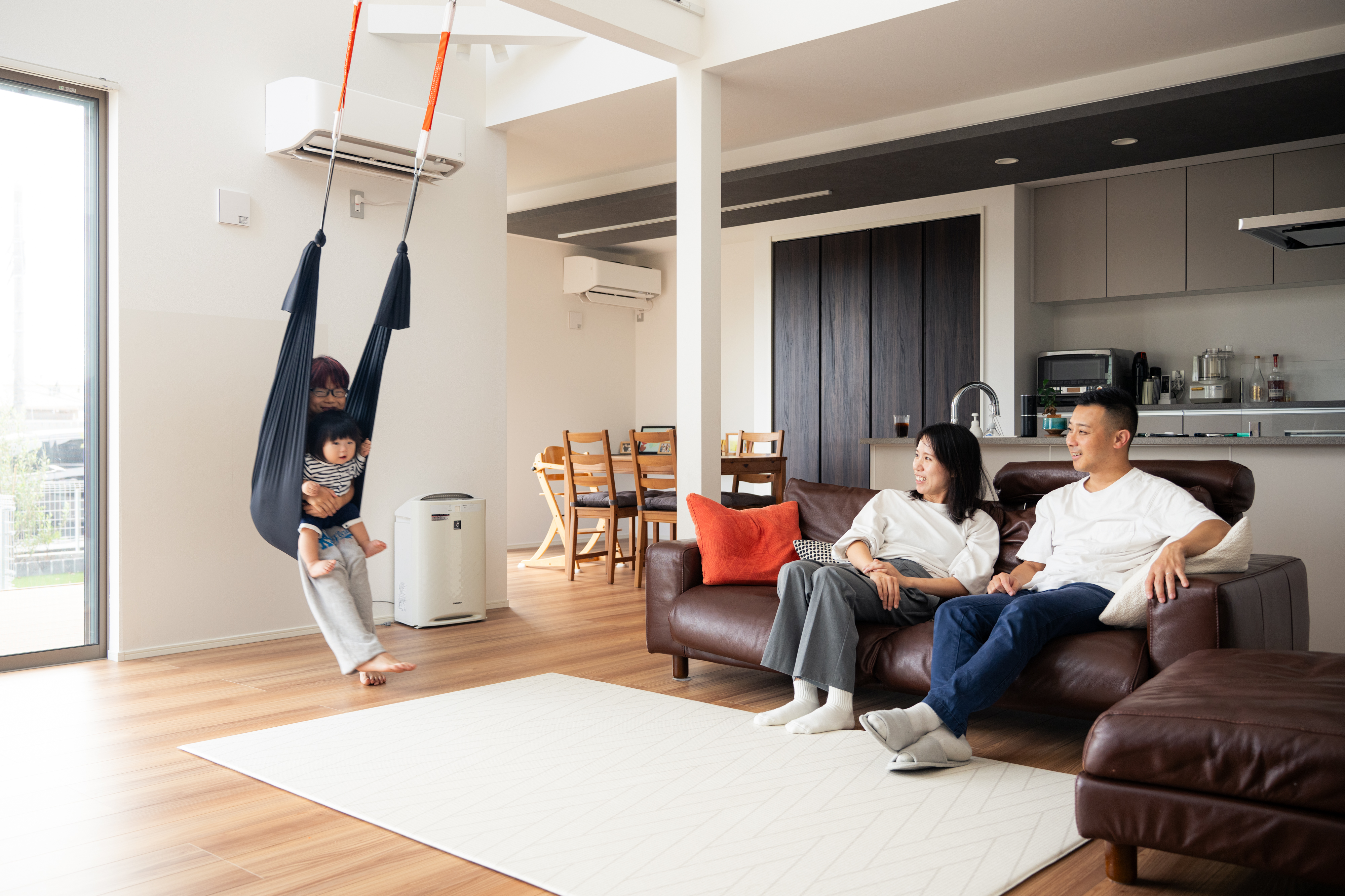 娘がピアノを弾いているとき、吹き抜けがホールのように反響して、綺麗に聴こえます。ピアノを習わせてよかったなと微笑ましく感じました。今は吹き抜けの梁にハンモックをかけていますが、今後ネットやボルダリングの壁を設置しようかと考えており、子どもがのびのび遊び回れるリビングにすることにワクワクしています。